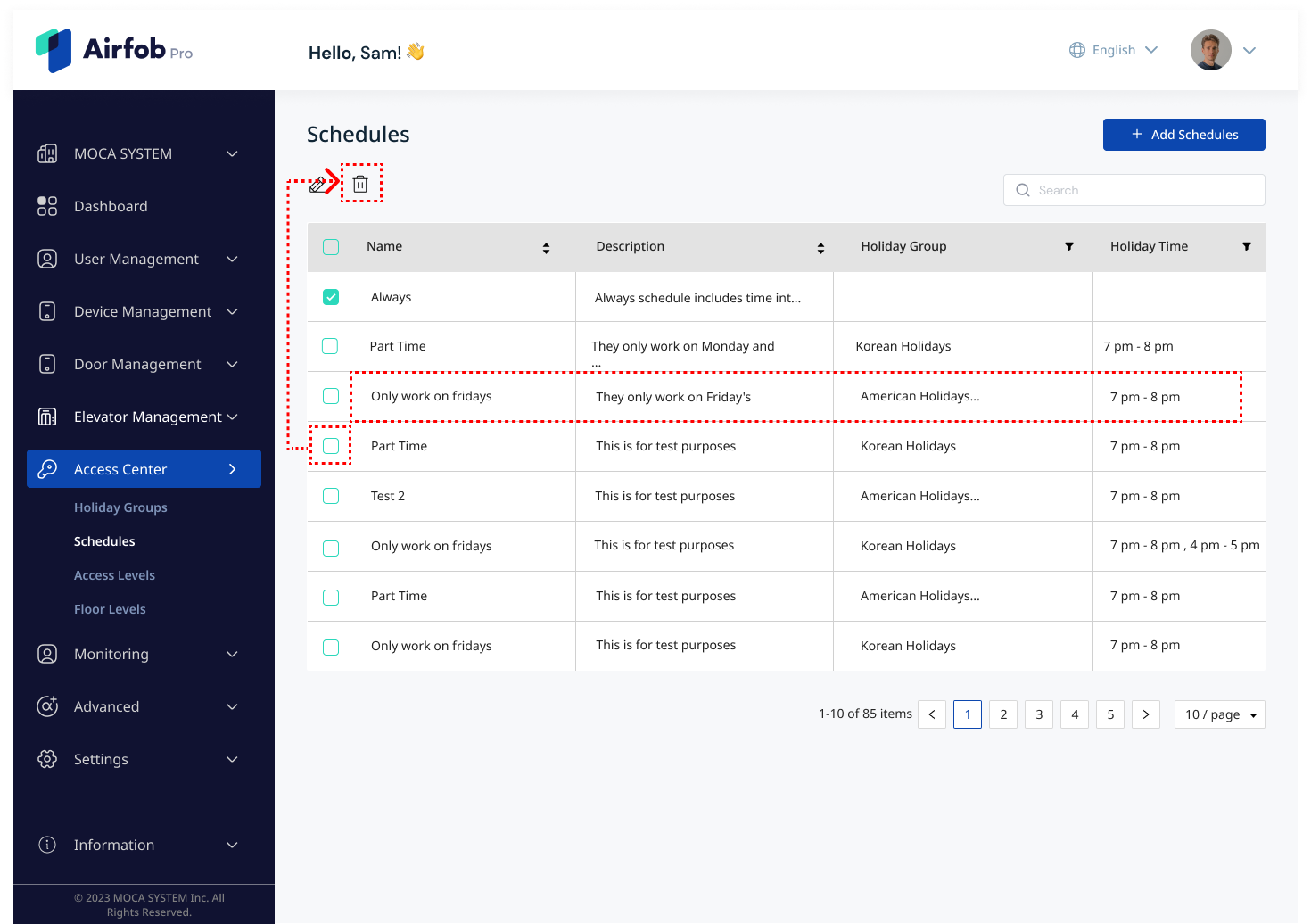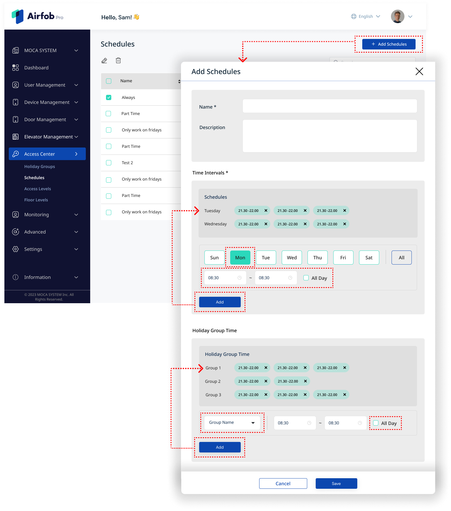 Schedules are related with various menus. It is applied in all the features that allow you to set the allowed or restricted times for access in the Airfob Pro Portal, such as Access Level, Floor Level, Elevator Schedule, Lock/Unlock Schedule, etc. Before setting up each feature, first make sure that the required schedule has been created in the Schedule menu.