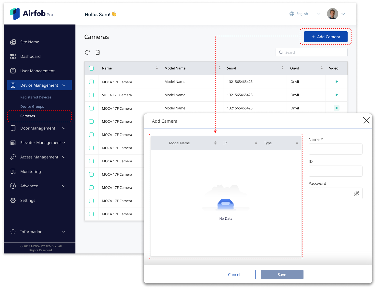 In the Device Management > Cameras menu, you need to add installed cameras to view their videos in the Airfob Pro portal and app.