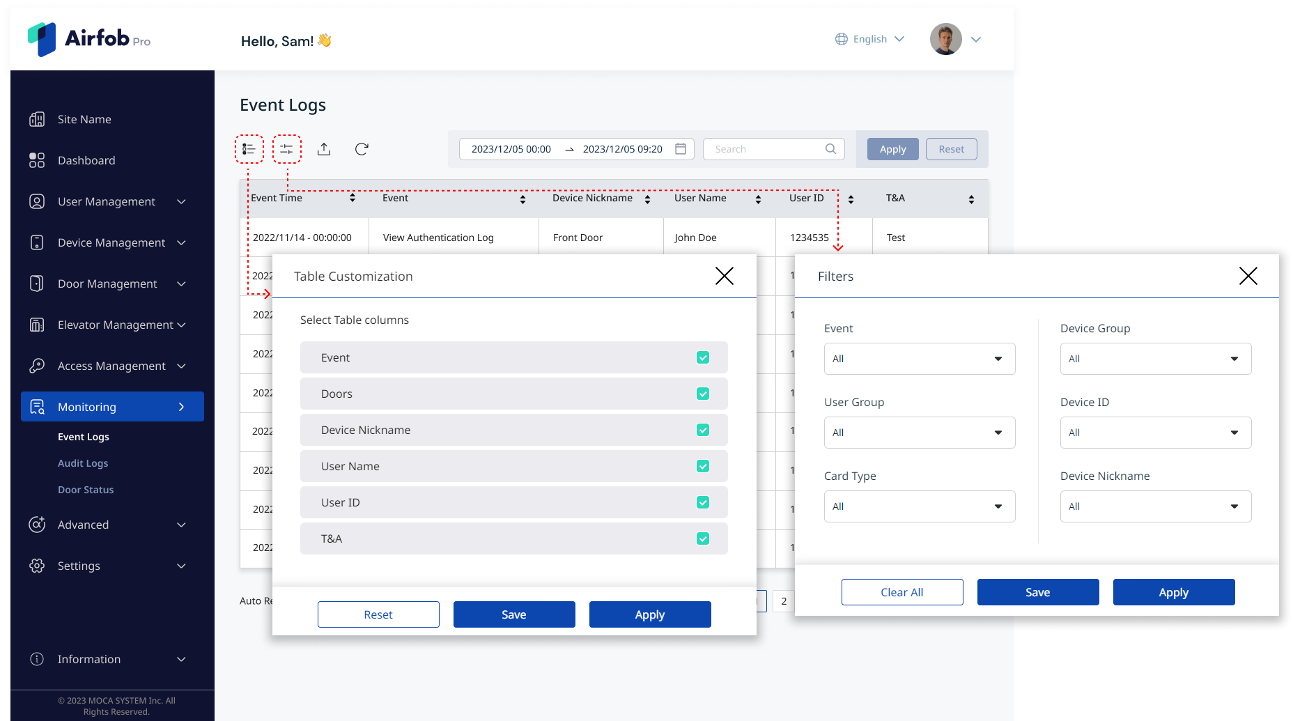 The Event logs menu shows what is happening to the doors and users on your site in real-time.