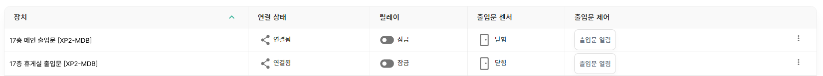 출입문 상태 메뉴에서는 장치(모바일 카드 리더기)가 설치되어 있는 출입문의 상태를 실시간으로 모니터링 하거나, 필요에 따라서는 원격으로 해당 출입문을 열고 닫는 제어가 가능합니다.