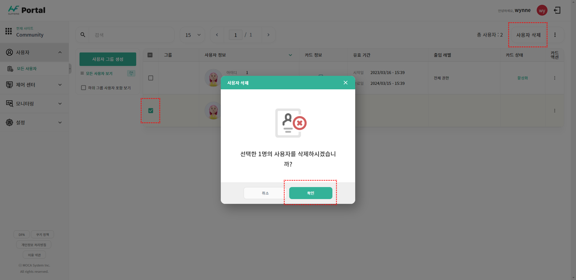 사용자 삭제 팝업 화면의 확인 버튼을 클릭합니다. 확인 시 정보는 즉시 삭제되며 복구할 수 없으니 주의하세요.