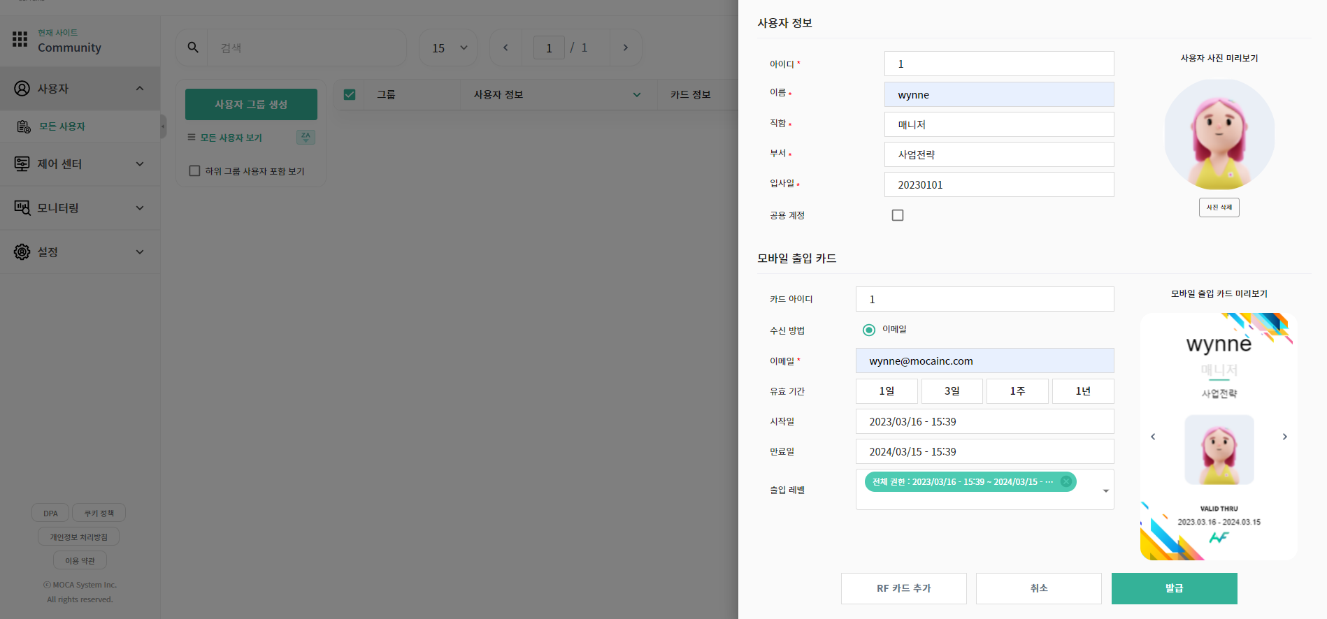 화면 오른쪽 상단의 사용자 추가 텍스트 버튼을 클릭하면, 사용자를 1명을 추가할 수 있습니다. 신규 사용자 추가 팝업 화면에서 아래의 항목들을 상황에 맞게 입력하세요. 사용자 추가와 동시에 모바일 카드 또는 RF 카드를 발급할 수 있습니다.
