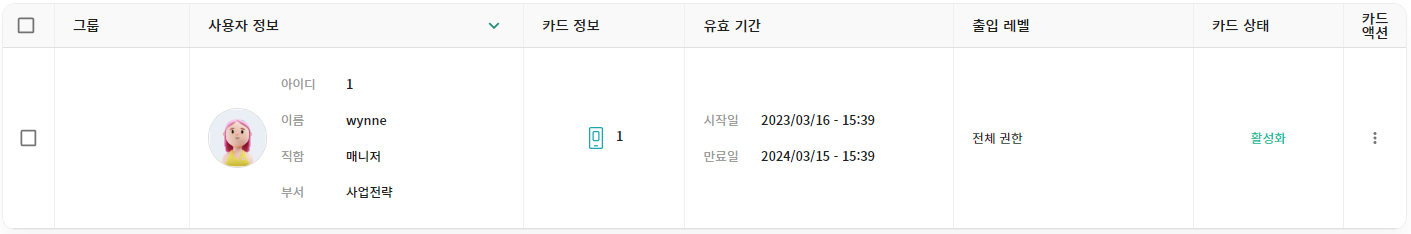 발급 버튼 : 저장된 정보로 선택한 종류의 카드가 즉시 발급 됩니다. 팝업 화면이 닫힌 후 목록에서 저장된 사용자 정보를 확인 및 수정할 수 있습니다.
