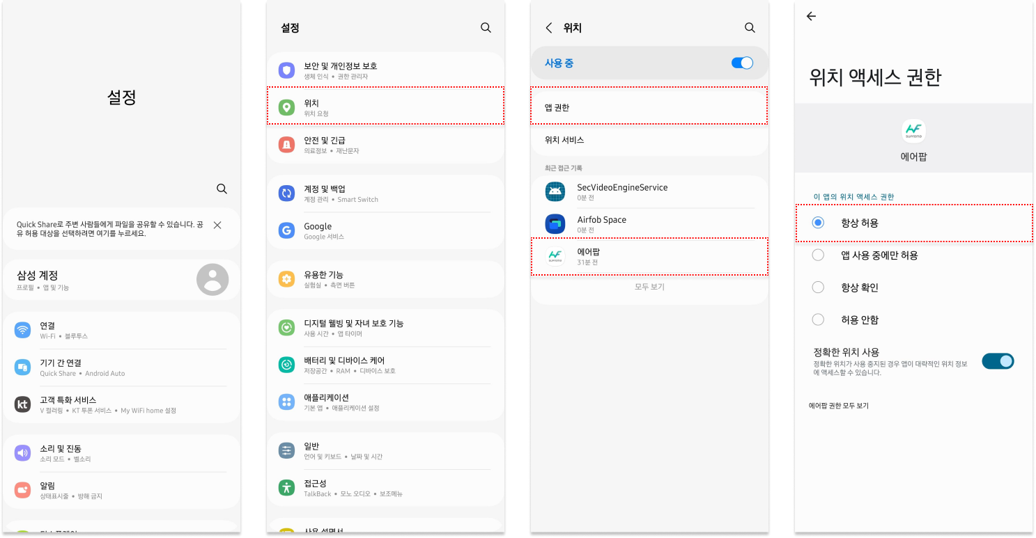 연결 방식을 상시 모드로 사용하시려면, 설정에서 위치 액세스 권한을 항상 허용을 변경하세요. 아래 이미지를 참고하셔서 휴대폰 설정을 변경하세요.