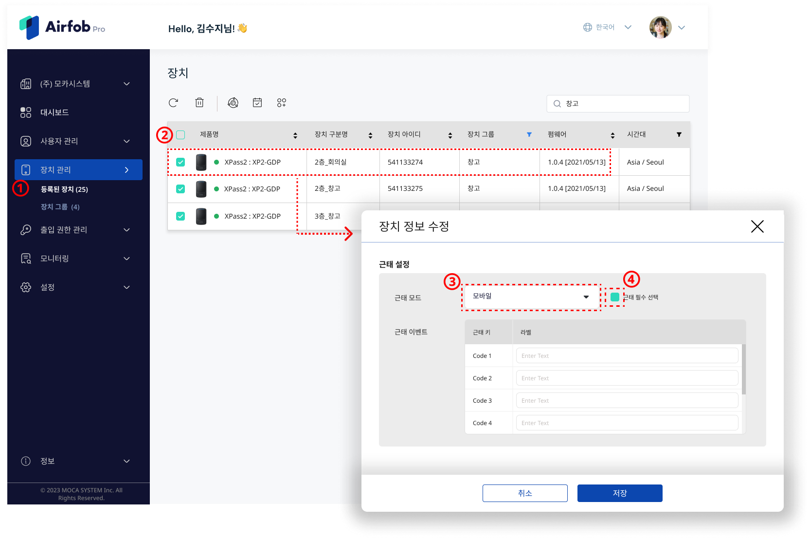 3. 장치 정보 수정 팝업 화면이 표시되면 화면의 아래의 근태 설정 영역으로 이동합니다.