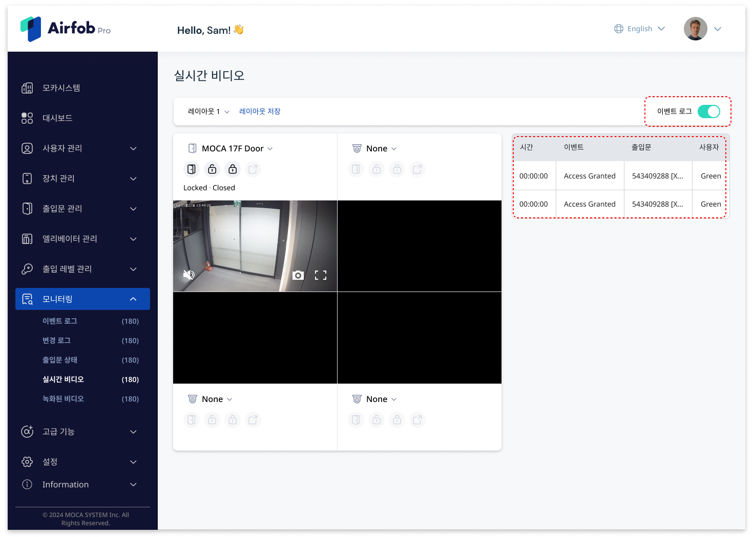 카메라와 에어팝 장치가 연결된 출입문에 이벤트가 발생하면, 이벤트 로그 메뉴에서도 비디오를 확인할 수 있습니다.