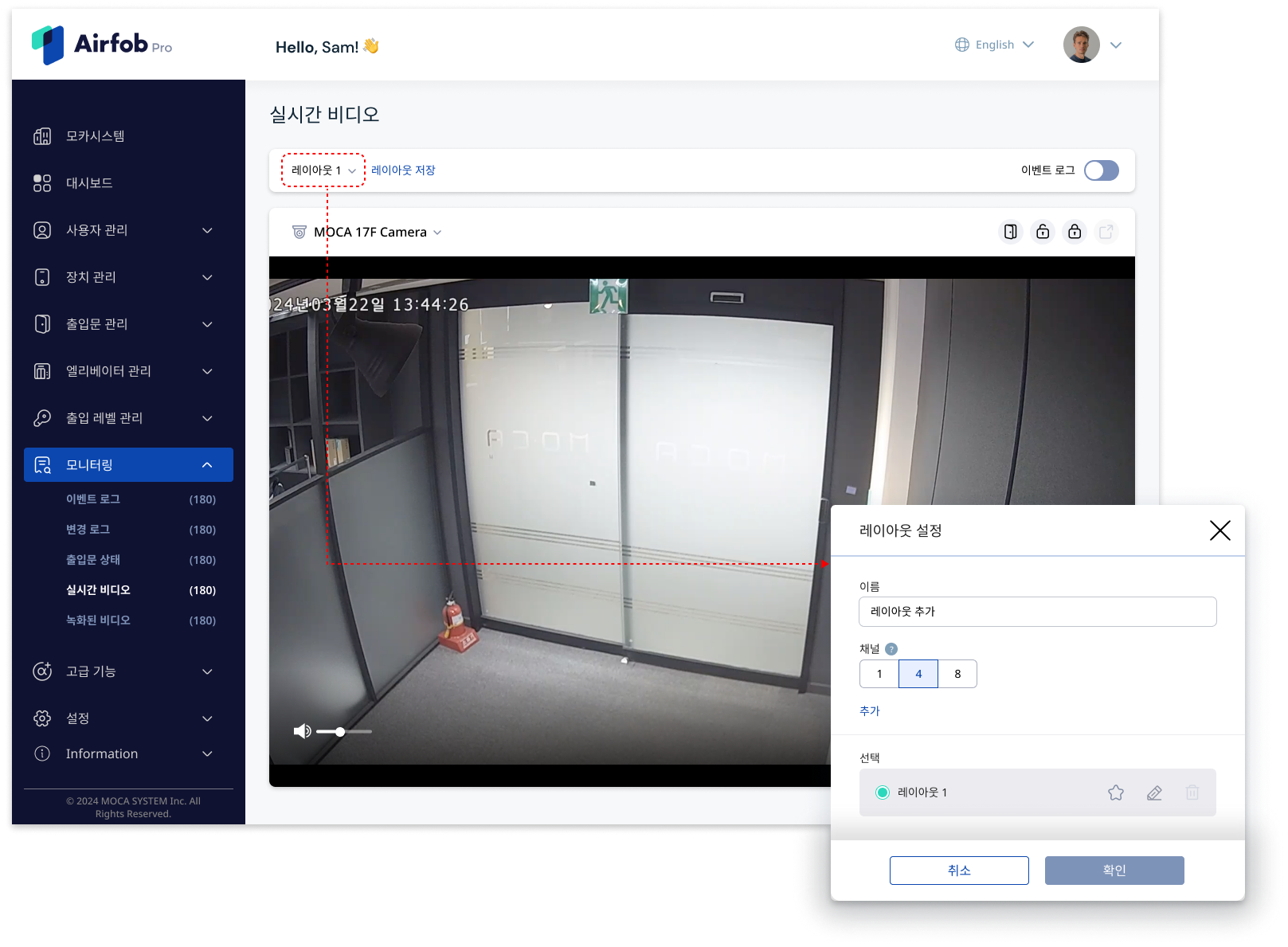 에어팝 프로 포탈의 모니터링 > 실시간 비디오 메뉴에서는 다양한 화면 레이아웃을 설정하고, 실시간으로 비디오를 확인할 수 있습니다.